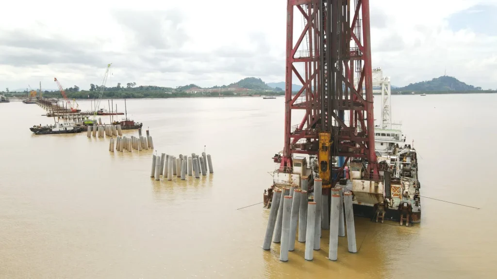 This spot in Sarawak, right by the river mouth, has tidal currents issues, unpredictable weather, and rough sea conditions. All of that constantly affected the piling operations. We had to carefully monitor the sea and weather conditions in order to complete the piling works. To keep things from falling behind schedule, the project team even brought in an extra piling rig, just to crank up the pace of the project.